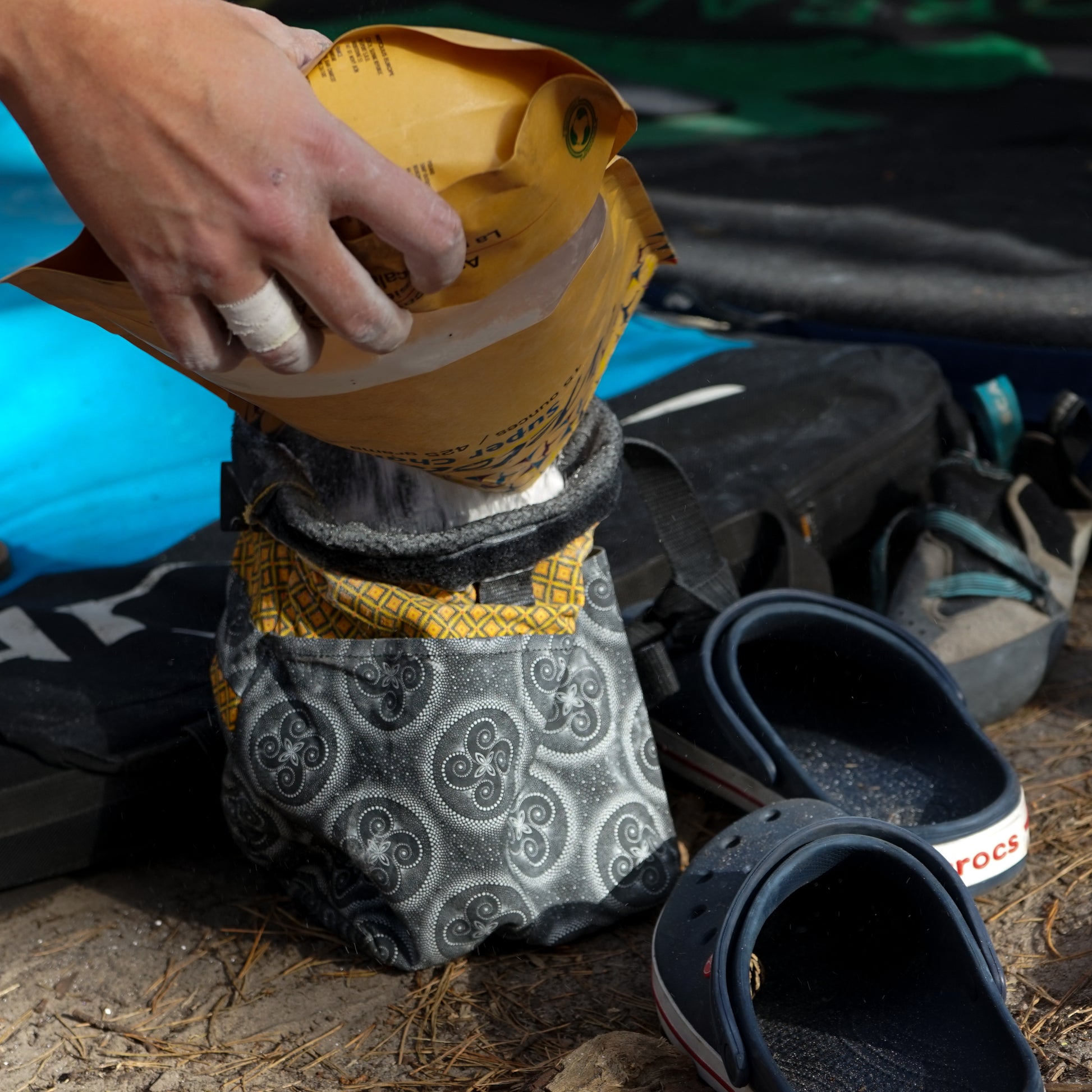 Wenn du besonders gut an dein Chalk rankommen willst, kannst du den Rand deines Chalk Buckets einfach umrollen. Durch den stabilen quadratischen Boden steht dein Chalk Bucket stets solide und kippt nicht so einfach um.