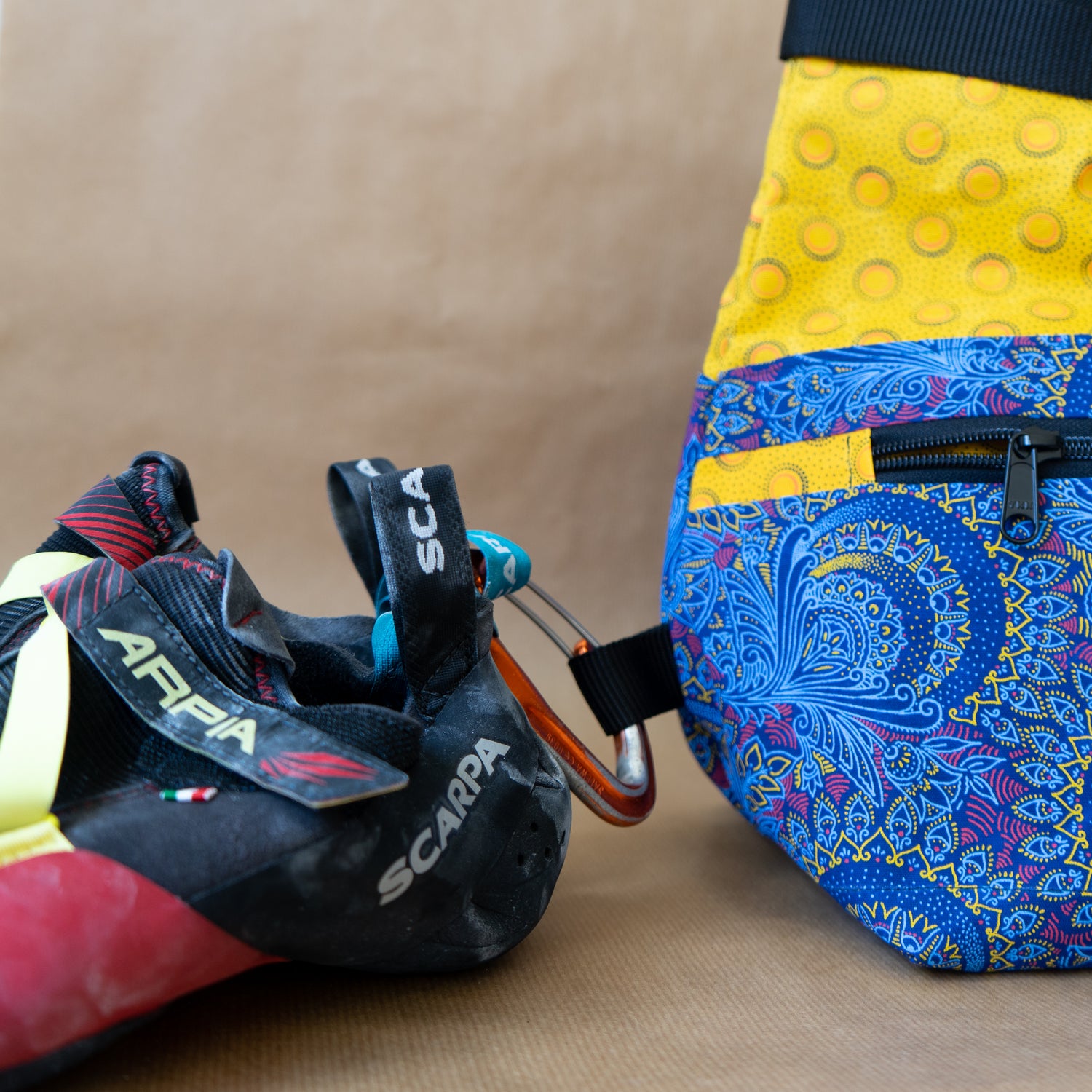 Mit einem Karabiner kannst du nicht nur deine Schuhe einfach ans Chalk Bucket anclippen. Noch viel besser: Hänge einfach dein Chalk Bucket außen an deinen Rucksack oder wenn du draußen unterwegs bist - direkt ans Crashpad!